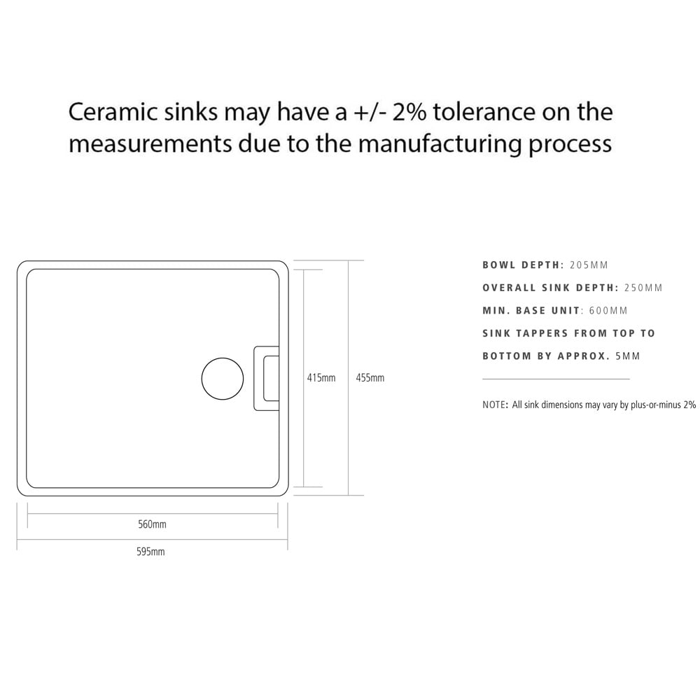 • Each ceramic sink is hand finished, so no two sinks are ever alike - sizes may vary by plus-or-minus 2%. We recommend measuring the actual sink before fitting to ensure the perfect fit.