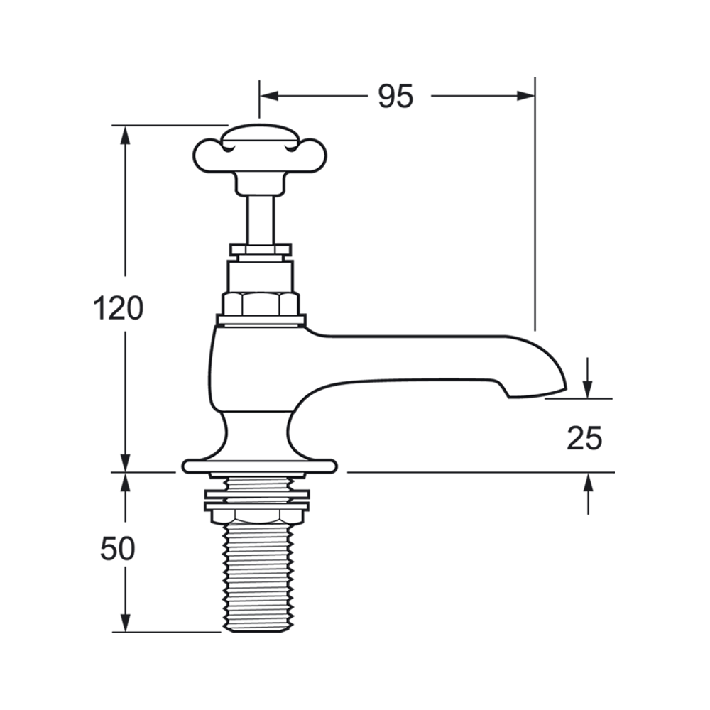 • Basin Taps: Height approximately 120mm, spout reach 95mm, spout height 25mm