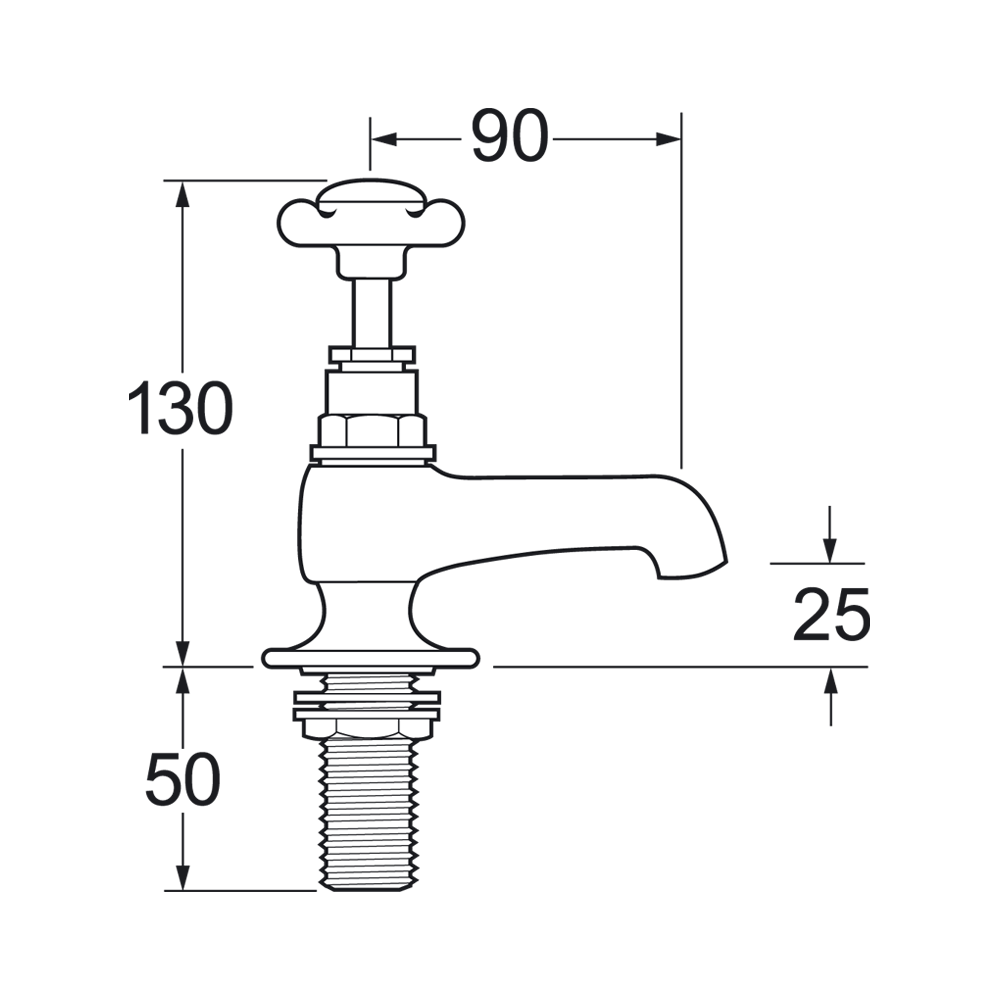 • Bath Taps: Height approximately 130mm, spout reach 90mm, spout height 25mm